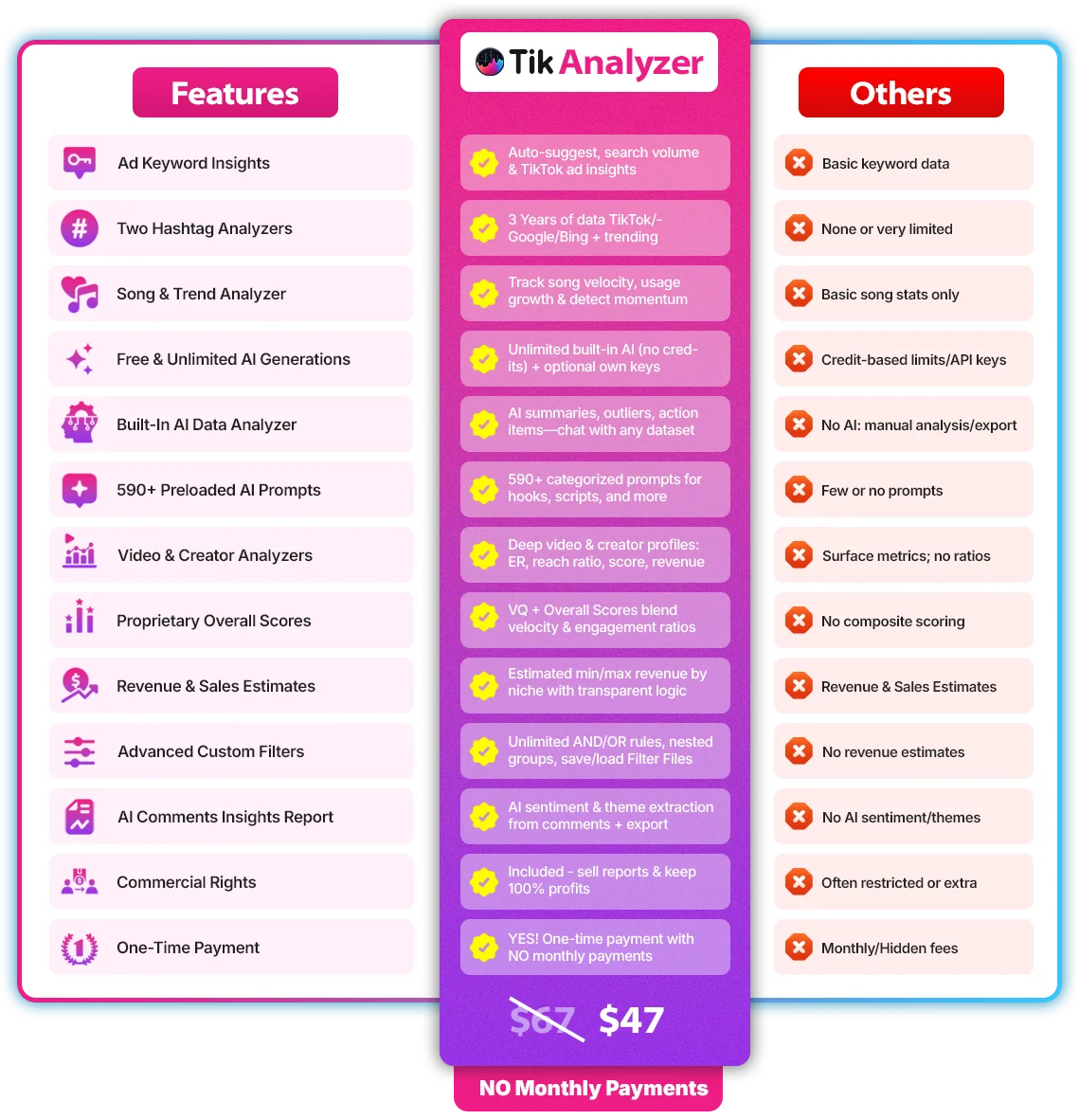 Tik Analyzer makes it easy to quickly understand what is working in my niche without wasting hours scrolling on my phone. This is a game-changer!