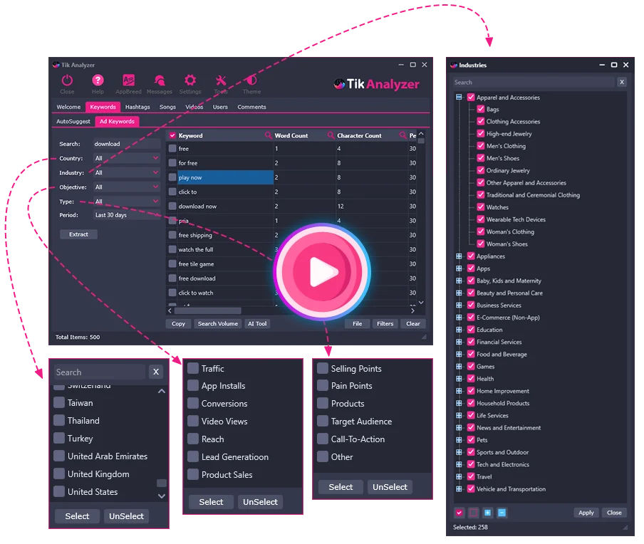 See the exact keywords and hashtags winning inside TikTok ads, filter by 100+ countries, 250+ industries, objectives, types, and time periods to zero in on what’s working now.