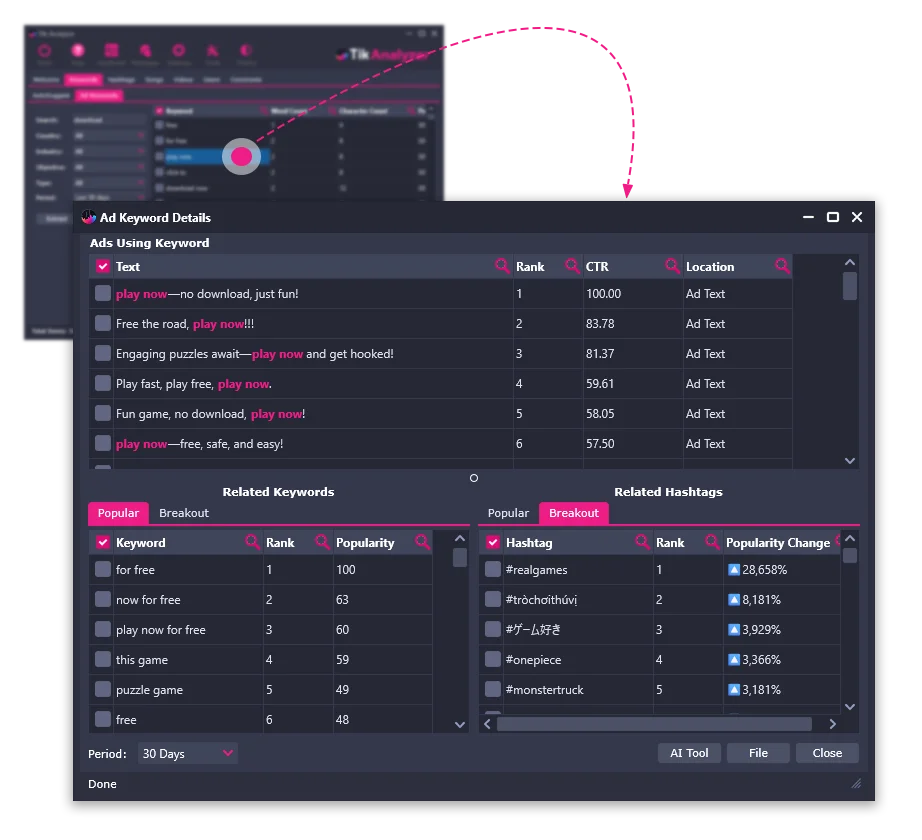 Spot breakout opportunities before they peak. Pull unlimited autosuggest ideas, mine Ad Keywords by country, industry, objective, and period, and surface Top 100 Hashtags with multi-period trend charts from 7 days to 3 years.