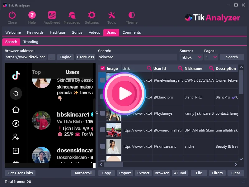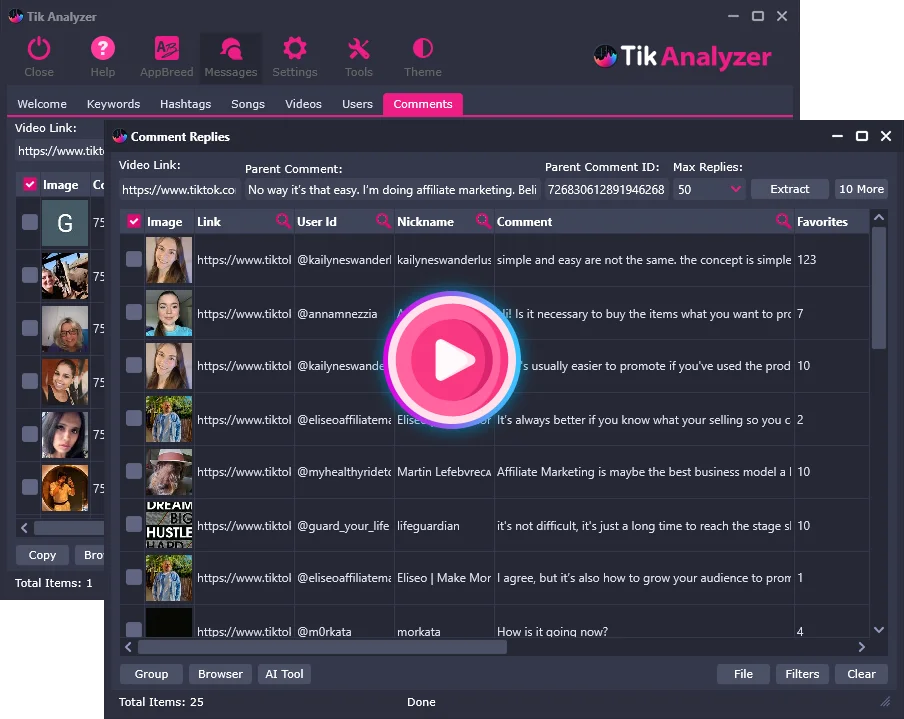 If a TikTok video URL is in the content, Tik Analyzer finds it, extracts it, and builds a clean, filter-ready dataset you can sort, score, and export, no manual copy-paste, no busywork.