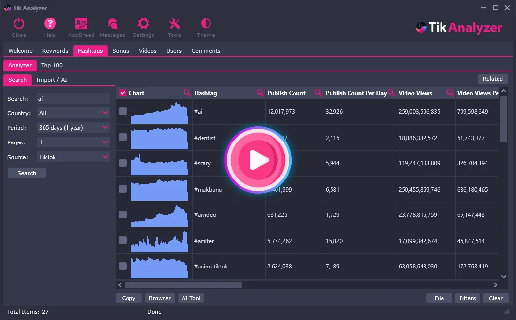 Get powerful insights from 11 built-in tools for revealing top viral content on TikTok